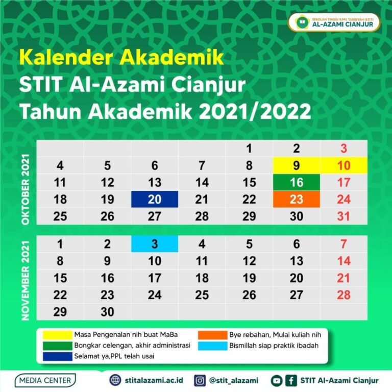 Kalender Akademik STIT Al-Azami Tahun [Tahun Ajaran] Kalender Akademik adalah panduan resmi seluruh kegiatan akademik, yang meliputi masa perkuliahan, Ujian Tengah Semester (UTS), Ujian Akhir Semester (UAS), libur, dan kegiatan non-akademik lainnya. Tinjauan Kalender (T.A. [Tahun Ajaran]) Unduh Dokumen Resmi UNDUH KALENDER AKADEMIK (PDF) Jadwal Kunci Semester Ganjil T.A. 2024/2025 No.Kegiatan AkademikTanggal PelaksanaanKeterangan 1Pengisian/Perubahan KRS1 – 10 September 2024Wajib bagi semua mahasiswa aktif. 2Awal Perkuliahan16 September 2024Sesuai jadwal yang tercantum di SIAKAD. 3Ujian Tengah Semester (UTS)18 – 23 November 2024Dilaksanakan sesuai jadwal prodi. 4Ujian Akhir Semester (UAS)13 – 18 Januari 2025Kegiatan wajib perkuliahan. 5Batas Akhir Input Nilai (KHS)31 Januari 2025Batas waktu pengiriman nilai ke BAAK.